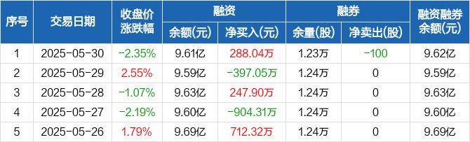 融资方面,当日融资买入3086.03万元,融资偿还2797.99万元,融资净买入288.04万元。融券方面,融券卖出0股,融券偿还100股,融券余量1.23万股,融券余额25.08万元。融资融券余额合计9.62亿元。