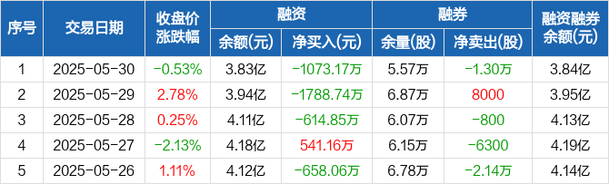 融资方面,当日融资买入1789.56万元,融资偿还2862.72万元,融资净偿还1073.17万元,连续3日净偿还累计3476.76万元。融券方面,融券卖出1.35万股,融券偿还2.65万股,融券余量5.57万股,融券余额157.46万元。融资融券余额合计3.84亿元。