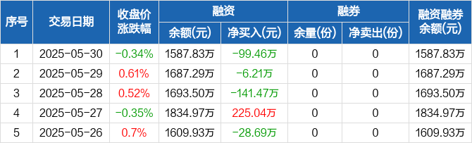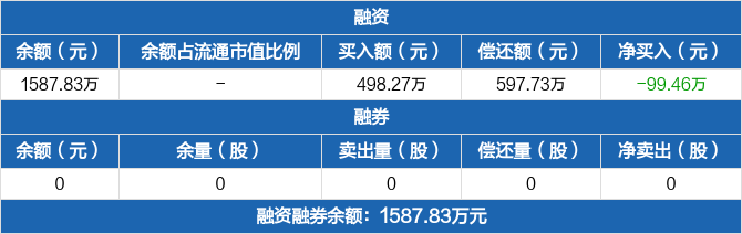 融资方面,当日融资买入498.27万元,融资偿还597.73万元,融资净偿还99.46万元,连续3日净偿还累计247.14万元。融券方面,融券卖出0份,融券偿还0份,融券余量0份,融券余额0元。融资融券余额合计1587.83万元。