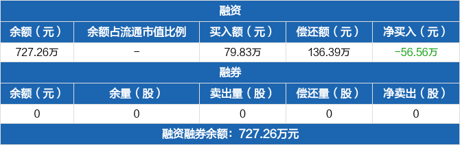 融资方面,当日融资买入79.83万元,融资偿还136.39万元,融资净偿还56.56万元。融券方面,融券卖出0份,融券偿还0份,融券余量0份,融券余额0元。融资融券余额合计727.26万元。