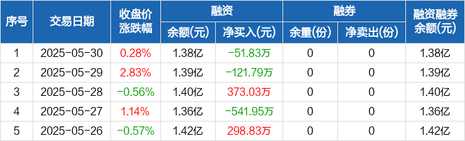 融资方面,当日融资买入872.12万元,融资偿还923.95万元,融资净偿还51.83万元。融券方面,融券卖出0份,融券偿还0份,融券余量0份,融券余额0元。融资融券余额合计1.38亿元。