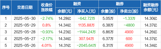 融资方面,当日融资买入5696.02万元,融资偿还6338.74万元,融资净偿还642.72万元。融券方面,融券卖出3000股,融券偿还1.63万股,融券余量5.05万股,融券余额216.8万元。融资融券余额合计14.3亿元。