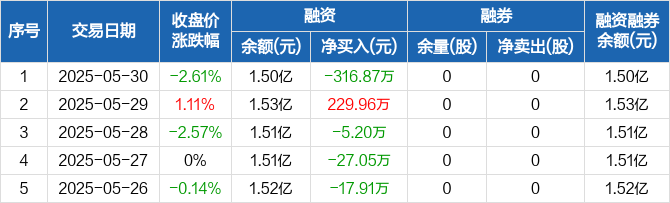 融资方面,当日融资买入329.16万元,融资偿还646.03万元,融资净偿还316.87万元。融券方面,融券卖出0股,融券偿还0股,融券余量0股,融券余额0元。融资融券余额合计1.5亿元。