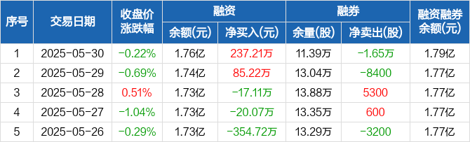 融资方面,当日融资买入1183.49万元,融资偿还946.29万元,融资净买入237.21万元。融券方面,融券卖出400股,融券偿还1.69万股,融券余量11.39万股,融券余额312.09万元。融资融券余额合计1.79亿元。