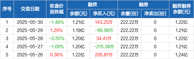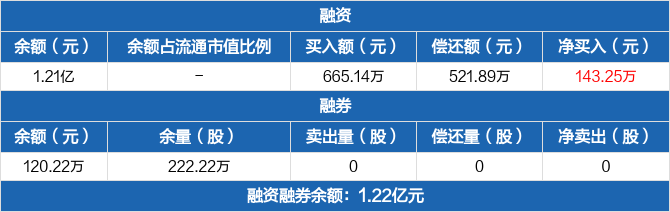 融资方面,当日融资买入665.14万元,融资偿还521.89万元,融资净买入143.25万元。融券方面,融券卖出0份,融券偿还0份,融券余量222.22万份,融券余额120.22万元。融资融券余额合计1.22亿元。