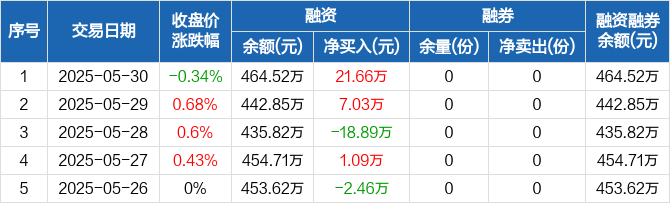 融资方面,当日融资买入43.18万元,融资偿还21.51万元,融资净买入21.66万元。融券方面,融券卖出0份,融券偿还0份,融券余量0份,融券余额0元。融资融券余额合计464.52万元。