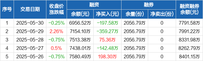 融资方面,当日融资买入145.61万元,融资偿还343.19万元,融资净偿还197.58万元。融券方面,融券卖出0份,融券偿还0份,融券余量2056.79万份,融券余额835.06万元。融资融券余额合计7791.58万元。