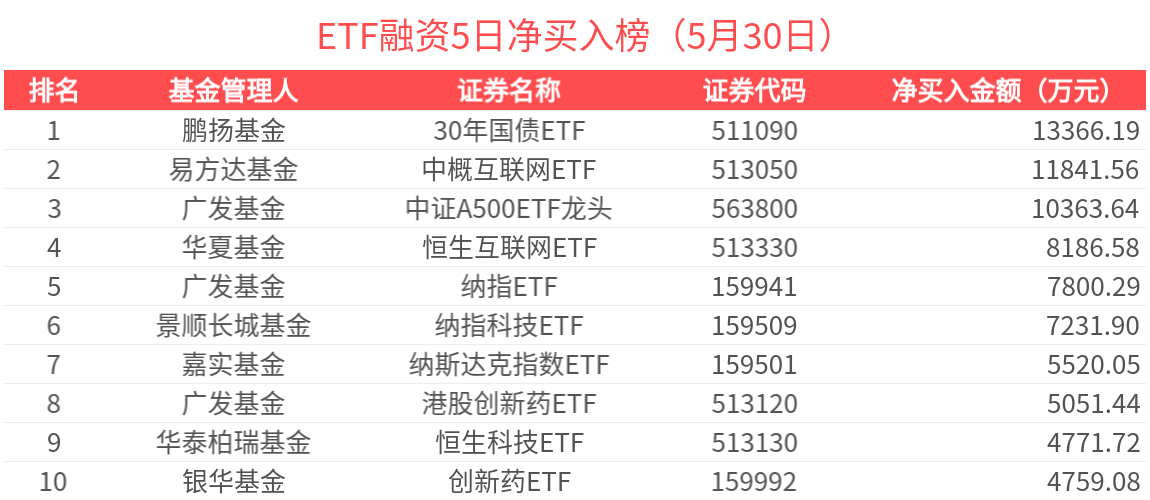 2025年5月30日,共166只ETF基金获融资净买入,21只ETF基金融券净卖出。融资净买入金额超500万元的有31只,恒生互联网ETF(513330.SH)、创新药ETF(159992.SZ)、恒生科技ETF(513130.SH)、恒生科技指数ETF(513180.SH)、港股创新药ETF(159567.SZ)杠杆资金显著流入,分别净流入8723.79万元、5208.96万元、3919.81万元、3226.41万元、2572.36万元。