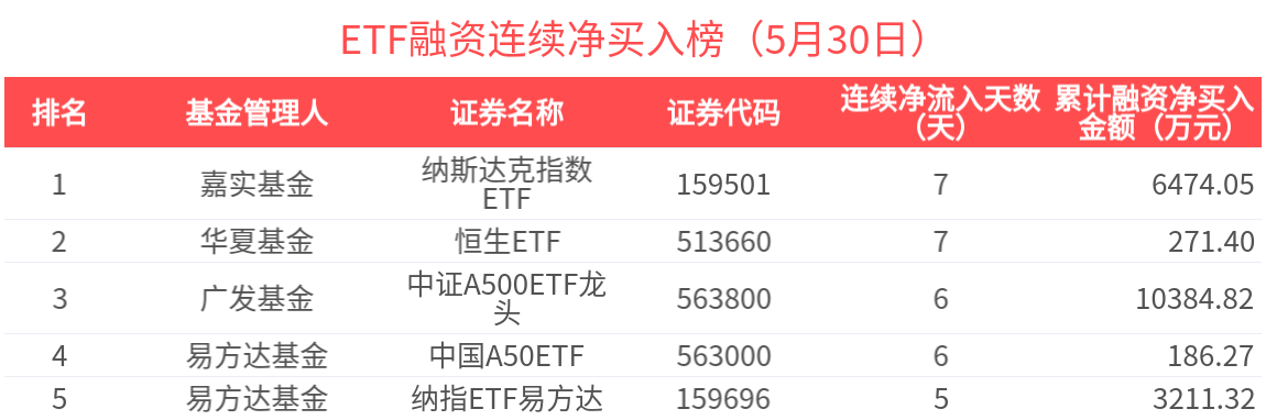 近期获杠杆资金连续融资净买入的ETF基金有60只,居前的为纳斯达克指数ETF(7天)、恒生ETF(7天)、中证A500ETF龙头(6天)、中国A50ETF(6天)、纳指ETF易方达(5天)等,分别净买入6474.05万元、271.40万元、1.04亿元、186.27万元、3211.32万元。其中,纳斯达克指数ETF近7天获杠杆资金加速买入,近7天杠杆资金累计流入6474.05万元。