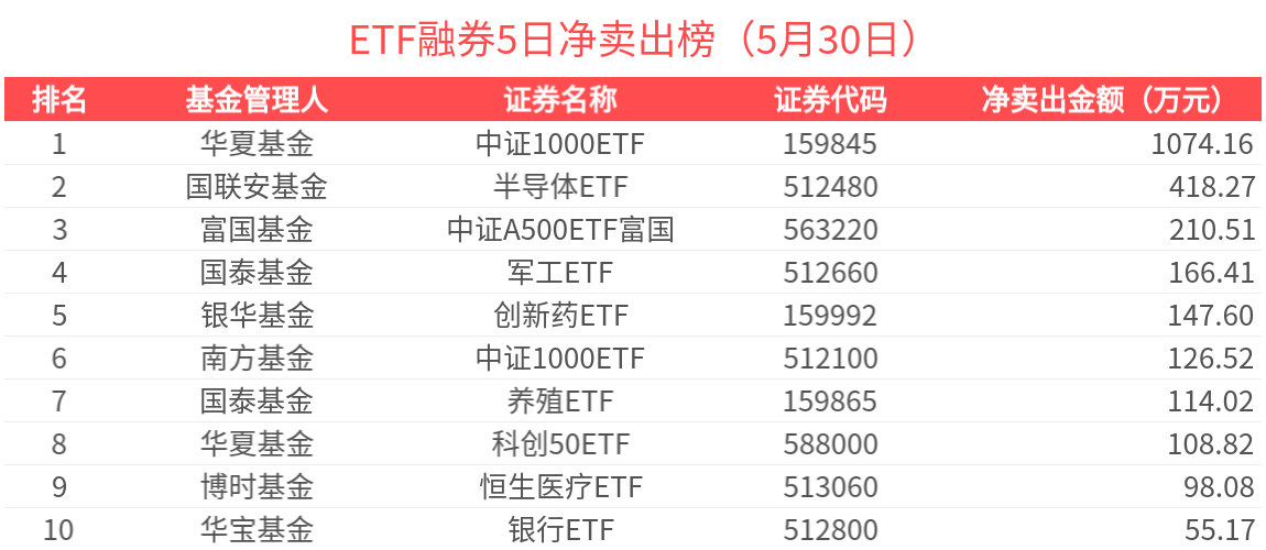 拉长时间看,近5天获杠杆资金融券净卖出超过500万元的有1只,金额居前的为中证1000ETF等,净流出1074.16万元。中证1000ETF近5天获杠杆资金大幅融券净卖出,达到成交额的0.72%。