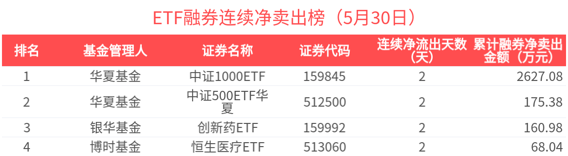 近期获杠杆资金连续融券净卖出的ETF基金有4只,居前的为中证1000ETF(2天)、中证500ETF华夏(2天)、创新药ETF(2天)、恒生医疗ETF(2天)等,分别净卖出2627.08万元、175.38万元、160.98万元、68.04万元。其中,中证1000ETF近2天获杠杆资金加速流出,近2天杠杆资金累计流出2627.08万元。