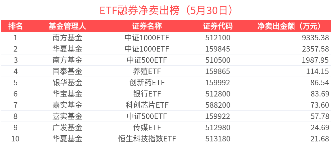 融券净卖出金额超500万元的有3只,中证1000ETF(512100.SH)、中证1000ETF(159845.SZ)、中证500ETF(510500.SH)杠杆资金显著流出,分别净流出9335.38万元、2357.58万元、1987.95万元。