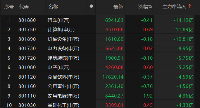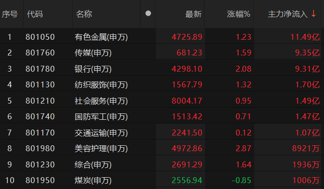 上证报中国证券网讯截至6月3日10时45分,申万一级行业板块中,主力资金净流入有色金属、传媒、银行等板块,其中,有色金属板块净流入超11亿元。主力资金净流出汽车、计算机、机械设备等板块,其中,汽车板块净流出超14亿元。