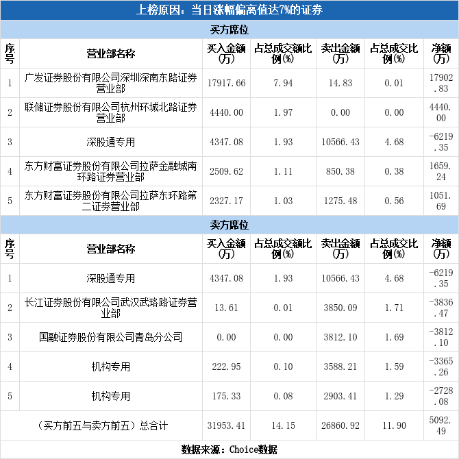 今日龙虎榜单上出现了深股通的身影,占据了买三、卖一的位置,净卖出6219.35万元,占当日成交总额的2.75%。