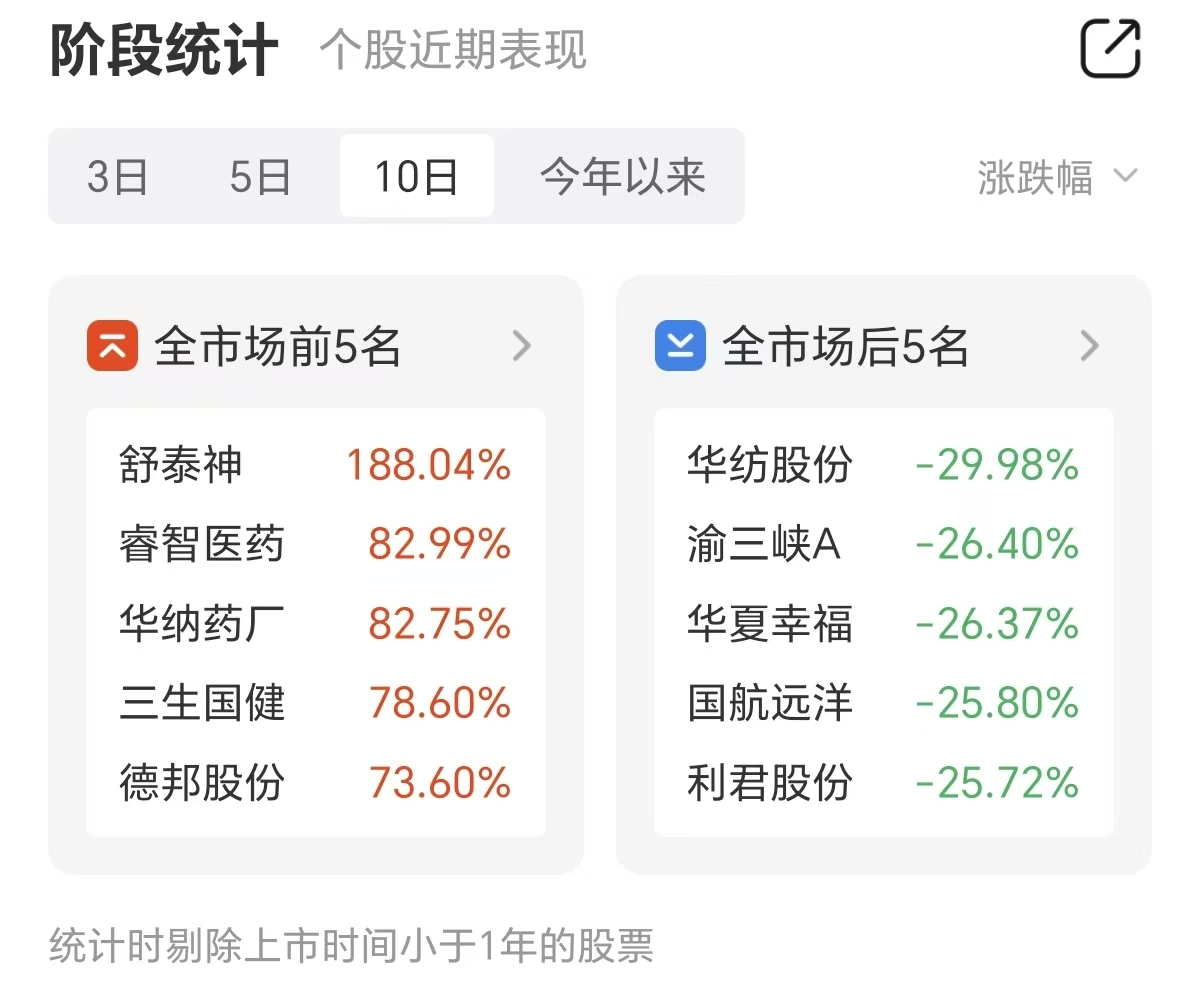 与此同时,近十个交易日涨幅前四名的个股分别为舒泰神、睿智医药、华纳药厂、三生国健、德邦股份。