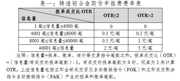 铸造铝合金期货对客户信息量收取申报费,如下表所示。