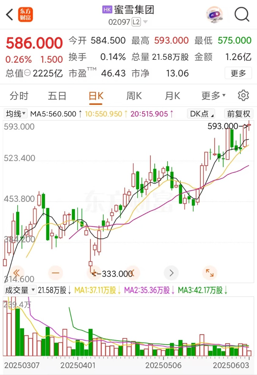 6月3日(周二)港股蜜雪集团再创新高,盘中股价最高触及593.000港元。截至收盘最新股价为586.000港元,当日涨幅0.26%,上市以来涨幅高达189.38%,总市值达2225亿港元(2038亿人民币)。