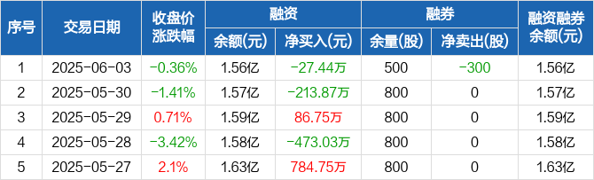 融资方面,当日融资买入237.98万元,融资偿还265.42万元,融资净偿还27.44万元。融券方面,融券卖出0股,融券偿还300股,融券余量500股,融券余额1395元。融资融券余额合计1.56亿元。