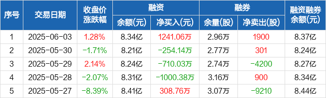 融资方面,当日融资买入3877.02万元,融资偿还2635.96万元,融资净买入1241.06万元。融券方面,融券卖出1900股,融券偿还0股,融券余量2.96万股,融券余额347.31万元。融资融券余额合计8.37亿元。