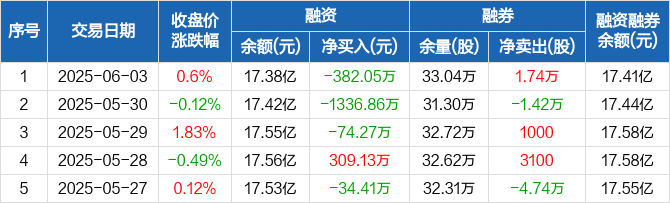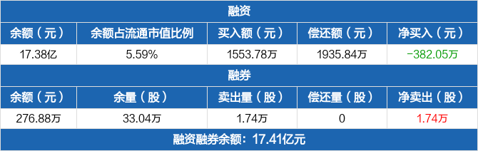 融资方面,当日融资买入1553.78万元,融资偿还1935.84万元,融资净偿还382.05万元,连续3日净偿还累计1793.19万元。融券方面,融券卖出1.74万股,融券偿还0股,融券余量33.04万股,融券余额276.88万元。融资融券余额合计17.41亿元。