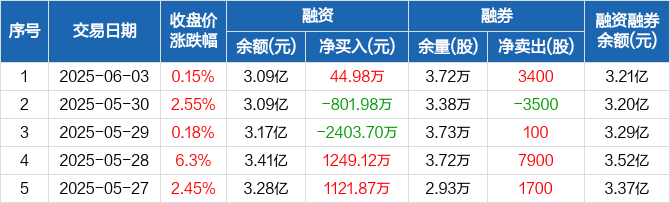融资方面,当日融资买入3170.38万元,融资偿还3125.4万元,融资净买入44.98万元。融券方面,融券卖出3600股,融券偿还200股,融券余量3.72万股,融券余额1193.18万元。融资融券余额合计3.21亿元。