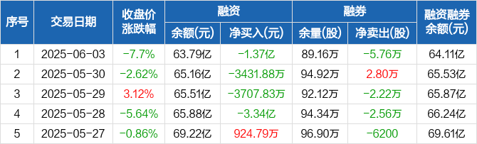 融资方面,当日融资买入5.26亿元,融资偿还6.63亿元,融资净偿还1.37亿元,净偿还额两市排名第四,连续4日净偿还累计5.42亿元。融券方面,融券卖出2.08万股,融券偿还7.84万股,融券余量89.16万股,融券余额3151.81万元。融资融券余额合计64.11亿元。