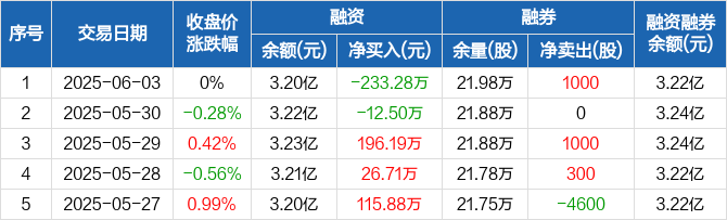 融资方面,当日融资买入447.72万元,融资偿还680.99万元,融资净偿还233.28万元。融券方面,融券卖出1000股,融券偿还0股,融券余量21.98万股,融券余额155.62万元。融资融券余额合计3.22亿元。