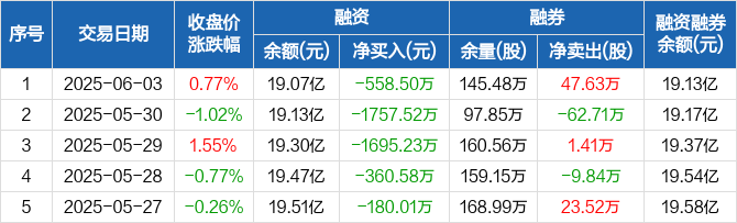 融资方面,当日融资买入6585.17万元,融资偿还7143.67万元,融资净偿还558.5万元,连续9日净偿还累计1.05亿元。融券方面,融券卖出47.63万股,融券偿还0股,融券余量145.48万股,融券余额571.74万元。融资融券余额合计19.13亿元。