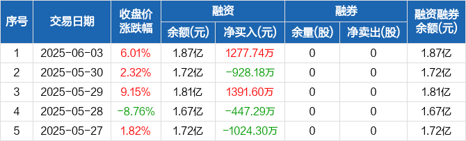 融资方面,当日融资买入5353.26万元,融资偿还4075.52万元,融资净买入1277.74万元。融券方面,融券卖出0股,融券偿还0股,融券余量0股,融券余额0元。融资融券余额合计1.87亿元。