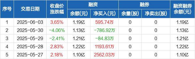 融资方面,当日融资买入2776.17万元,融资偿还2180.43万元,融资净买入595.74万元。融券方面,融券卖出0股,融券偿还0股,融券余量0股,融券余额0元。融资融券余额合计1.19亿元。