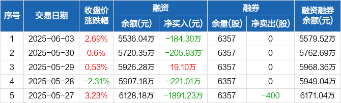 融资方面,当日融资买入923.69万元,融资偿还1107.99万元,融资净偿还184.3万元。融券方面,融券卖出0股,融券偿还0股,融券余量6357股,融券余额43.48万元。融资融券余额合计5579.52万元。