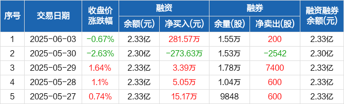 融资方面,当日融资买入636.15万元,融资偿还354.58万元,融资净买入281.57万元。融券方面,融券卖出200股,融券偿还0股,融券余量1.55万股,融券余额25.12万元。融资融券余额合计2.33亿元。