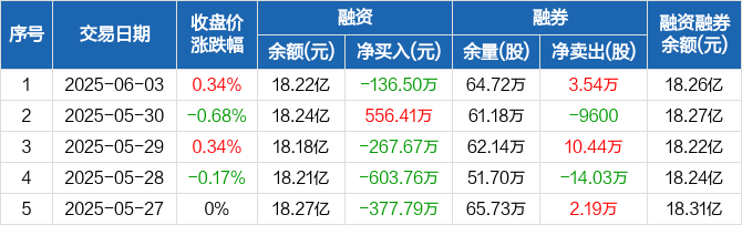 京沪高铁融资融券信息显示,2025年6月3日融资净偿还136.5万元;融资余额18.22亿元,较前一日下降0.07%。