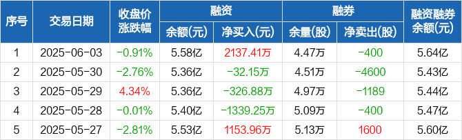 融资方面,当日融资买入3632.08万元,融资偿还1494.67万元,融资净买入2137.41万元。融券方面,融券卖出0股,融券偿还400股,融券余量4.47万股,融券余额652.42万元。融资融券余额合计5.64亿元。