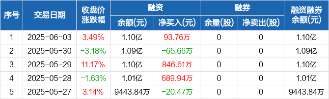 融资方面,当日融资买入3284.32万元,融资偿还3190.56万元,融资净买入93.76万元。融券方面,融券卖出0股,融券偿还0股,融券余量0股,融券余额0元。融资融券余额合计1.1亿元。