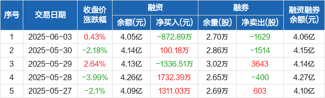 融资方面,当日融资买入781.73万元,融资偿还1654.62万元,融资净偿还872.89万元。融券方面,融券卖出0股,融券偿还1629股,融券余量2.7万股,融券余额113.38万元。融资融券余额合计4.06亿元。