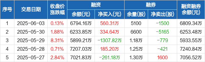 融资方面,当日融资买入902.61万元,融资偿还342.3万元,融资净买入560.31万元。融券方面,融券卖出1300股,融券偿还2800股,融券余量5100股,融券余额15.19万元。融资融券余额合计6809.34万元。