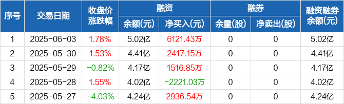 融资方面,当日融资买入7321.09万元,融资偿还1199.65万元,融资净买入6121.43万元,净买入额创历史新高,连续3日净买入累计1.01亿元。融券方面,融券卖出0股,融券偿还0股,融券余量0股,融券余额0元。融资融券余额合计5.02亿元。