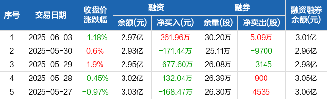融资方面,当日融资买入1251.54万元,融资偿还889.58万元,融资净买入361.96万元。融券方面,融券卖出5.45万股,融券偿还3644股,融券余量30.2万股,融券余额403.42万元。融资融券余额合计3.01亿元。