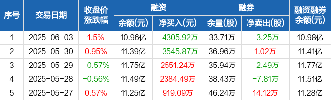 融资方面,当日融资买入5880.63万元,融资偿还1.02亿元,融资净偿还4305.92万元。融券方面,融券卖出7.46万股,融券偿还10.71万股,融券余量33.71万股,融券余额182.37万元。融资融券余额合计10.98亿元。