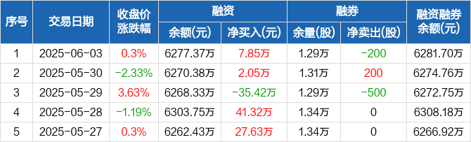 融资方面,当日融资买入87.44万元,融资偿还79.59万元,融资净买入7.85万元。融券方面,融券卖出0股,融券偿还200股,融券余量1.29万股,融券余额4.33万元。融资融券余额合计6281.7万元。