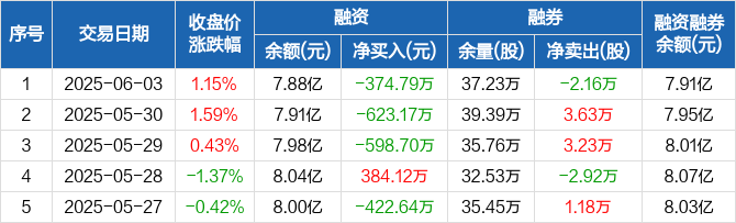 融资方面,当日融资买入2556.14万元,融资偿还2930.92万元,融资净偿还374.79万元,连续3日净偿还累计1596.66万元。融券方面,融券卖出2.89万股,融券偿还5.05万股,融券余量37.23万股,融券余额360.76万元。融资融券余额合计7.91亿元。