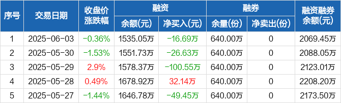 融资方面,当日融资买入98.37万元,融资偿还115.06万元,融资净偿还16.69万元,连续3日净偿还累计143.87万元。融券方面,融券卖出0份,融券偿还0份,融券余量640万份,融券余额534.4万元。融资融券余额合计2069.45万元。