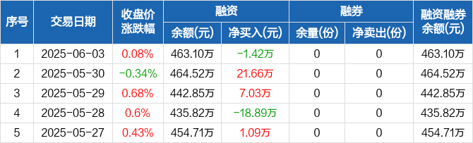 融资方面,当日融资买入55.1万元,融资偿还56.51万元,融资净偿还1.42万元。融券方面,融券卖出0份,融券偿还0份,融券余量0份,融券余额0元。融资融券余额合计463.1万元。