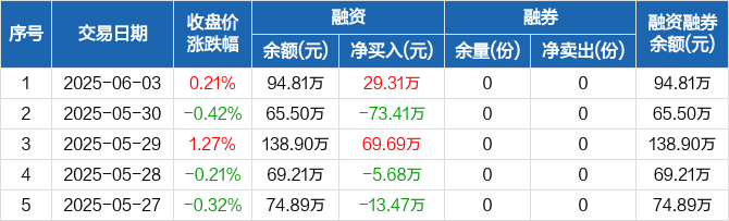 融资方面,当日融资买入39.39万元,融资偿还10.08万元,融资净买入29.31万元。融券方面,融券卖出0份,融券偿还0份,融券余量0份,融券余额0元。融资融券余额合计94.81万元。