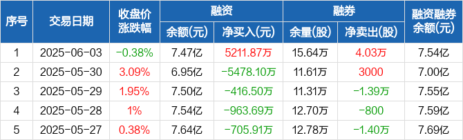 融资方面,当日融资买入1.02亿元,融资偿还4991.84万元,融资净买入5211.87万元,净买入额创12个月新高。融券方面,融券卖出4.09万股,融券偿还600股,融券余量15.64万股,融券余额696.54万元。融资融券余额合计7.54亿元。