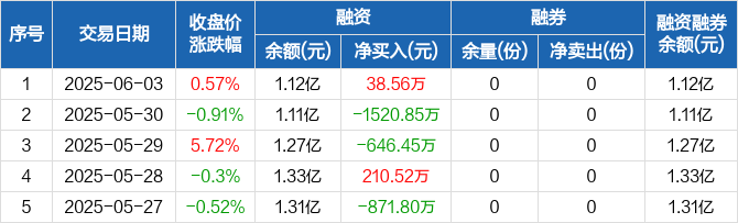 融资方面,当日融资买入2544.81万元,融资偿还2506.25万元,融资净买入38.56万元。融券方面,融券卖出0份,融券偿还0份,融券余量0份,融券余额0元。融资融券余额合计1.12亿元。