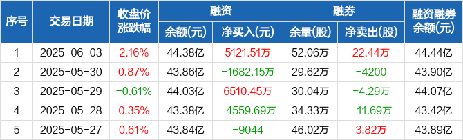 融资方面,当日融资买入2.83亿元,融资偿还2.32亿元,融资净买入5121.51万元。融券方面,融券卖出24.01万股,融券偿还1.57万股,融券余量52.06万股,融券余额614.83万元。融资融券余额合计44.44亿元。
