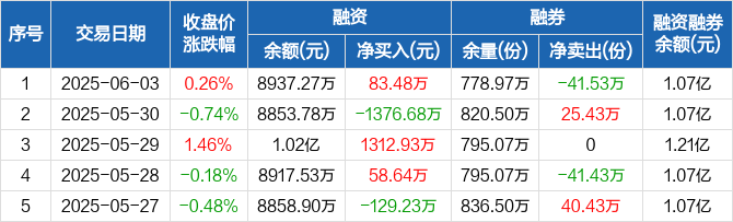 融资方面,当日融资买入610.72万元,融资偿还527.24万元,融资净买入83.48万元。融券方面,融券卖出9000份,融券偿还42.43万份,融券余量778.97万份,融券余额1774.49万元。融资融券余额合计1.07亿元。