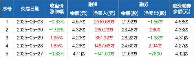 融资方面,当日融资买入4987.21万元,融资偿还2476.53万元,融资净买入2510.68万元,连续4日净买入累计4609.9万元。融券方面,融券卖出0股,融券偿还1.56万股,融券余量21.92万股,融券余额131.74万元。融资融券余额合计4.58亿元。